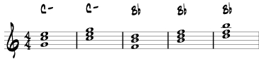 For example, let's look at the Cmin7 chord at the beginning of "Blue Bossa." The tune is in C minor, so the chord-scale for this chord is C natural minor, which is the same as E-flat major, so, theoretically, we can use any triad derived from the E-flat scale over this chord. Those triads are: E-flat major, F minor, G minor, A-flat major, B-flat major, C minor, D diminished. In this example, I'll just use the C minor triad, and one "upper structure triad," the B-flat major triad. Notice that the B-flat triad contains the b7 9 and 11 of C minor.